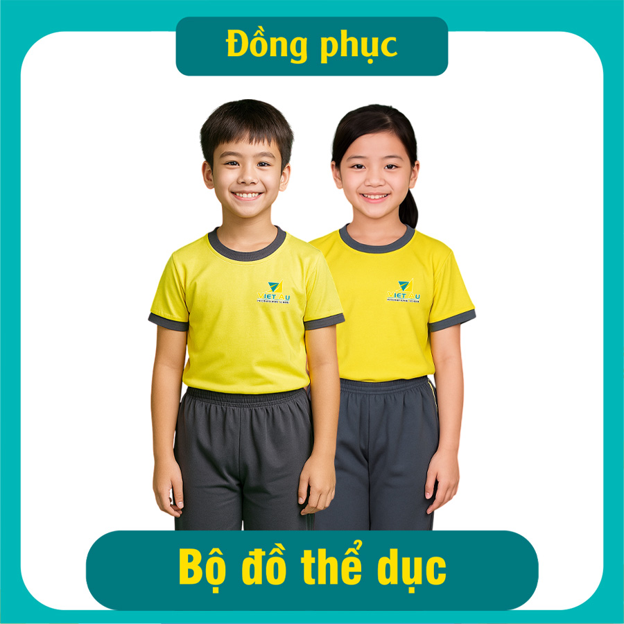 Trang phục thể dục với áo thun vàng tươi phối viền xám và logo Việt Âu là biểu tượng của sự năng động, hứng khởi và tinh thần rèn luyện thể chất.