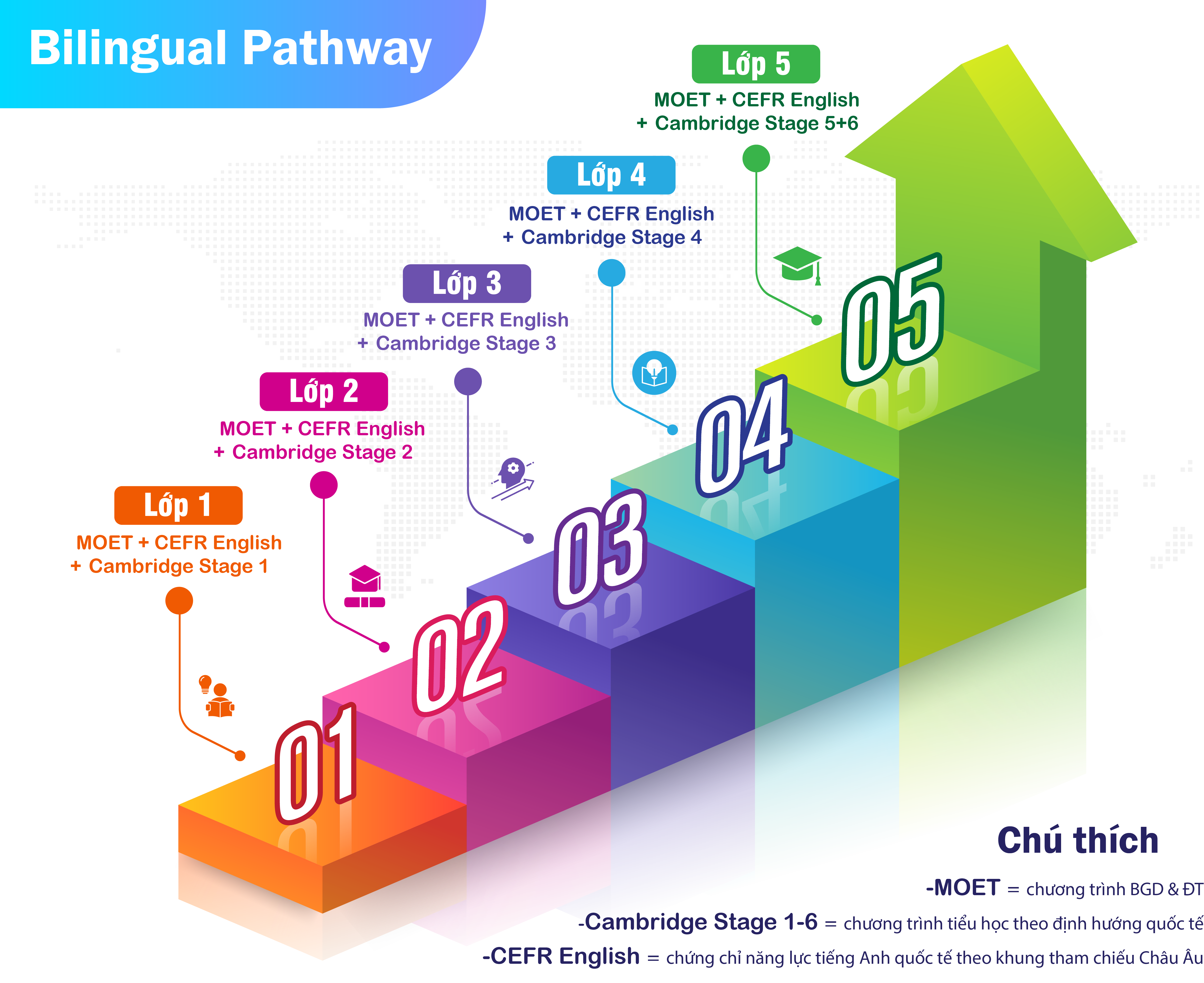 Khung đánh giá quốc tế: Học sinh được đánh giá theo chuẩn CEFR, khung năng lực Cambridge và kết hợp bài kiểm tra MOET, đảm bảo vừa đạt chuẩn quốc gia, vừa đạt chuẩn quốc tế.