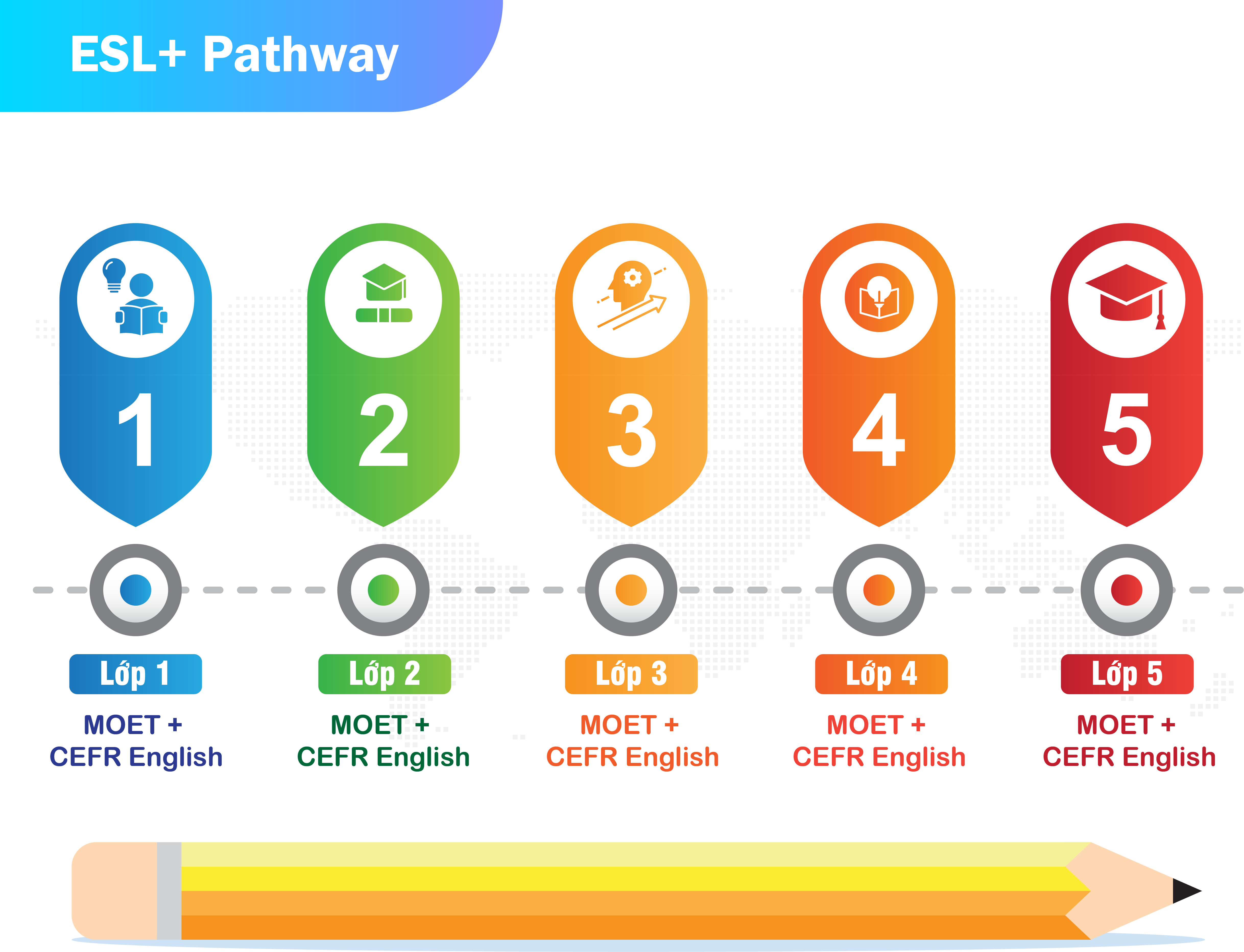 Hệ ESL+ là chương trình tăng cường tiếng Anh được thiết kế nhằm xây dựng nền tảng ngôn ngữ vững chắc cho học sinh, đặc biệt phù hợp với những em bắt đầu hoặc đang phát triển năng lực tiếng Anh. Chương trình tập trung vào bốn kỹ năng Nghe – Nói – Đọc – Viết theo chuẩn CEFR, kết hợp các chủ đề gắn với chương trình MOET để hỗ trợ học tập trên lớp.